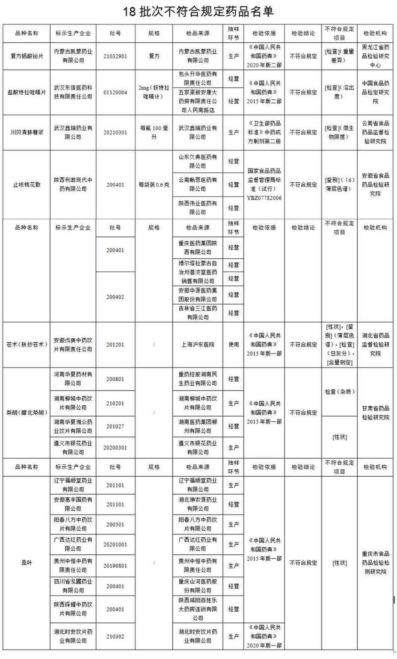 对上述不符合规定药品,药品监督管理部门已要求相关企业和单位采取暂停销售使用、召回等风险控制措施,对不符合规定原因开展调查并切实进行整改。
