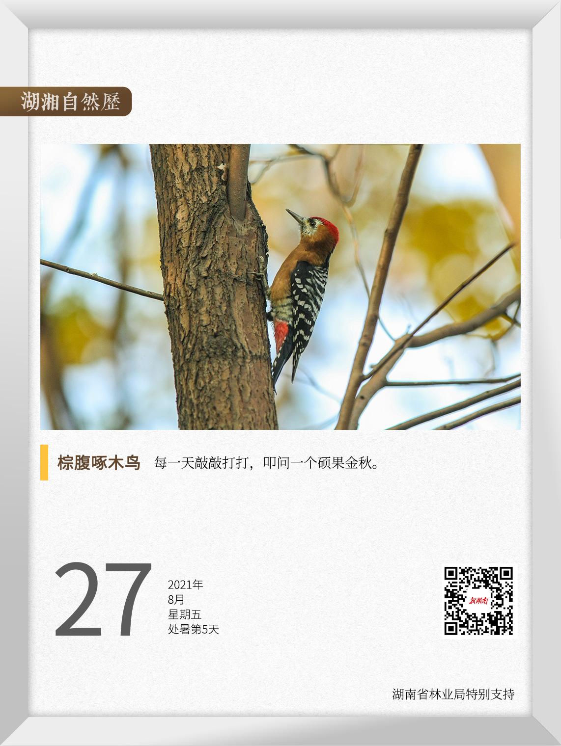 居住在湖南的啄木鸟有好几种,棕腹啄木鸟是其中颇为耀眼的一种。雄鸟头顶红冠,雌鸟头戴黑白间杂的“头巾”,从头至腹部大面积的棕红色羽毛宛如锦缎,背部层层叠叠的白色横纹平添美艳与霸气。当秋日灿烂的阳光洒落,它们简直熠熠生辉。