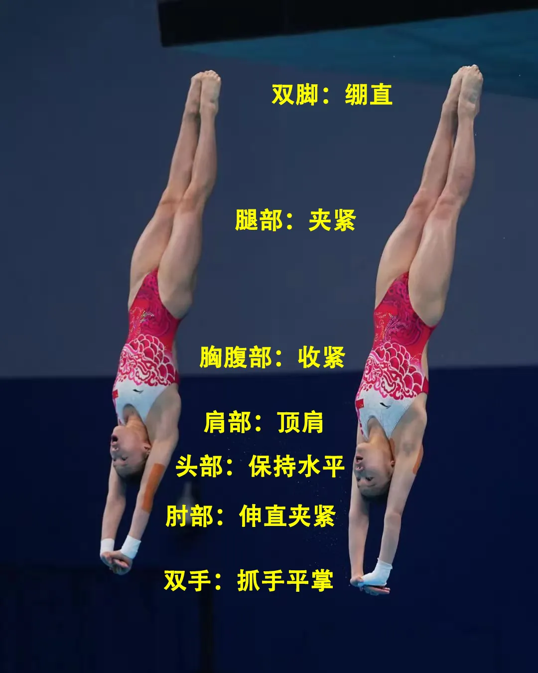 这种手势从表观上看,进一步减少了手掌与水的接触面积,能更大程度得减小冲击力。