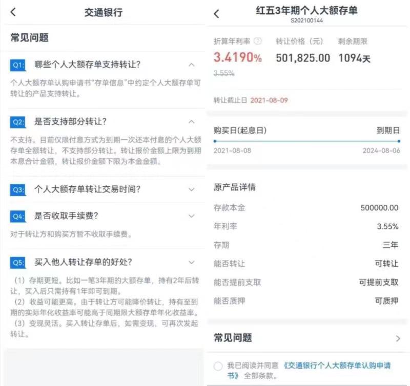 记者查询发现,除了浦发银行外,已有包括工商银行、建设银行、交通银行、招商银行、中信银行等多家银行支持线上转让大额存单。以交通银行为例,该行此前发布的说明称,目前在售的大额存单均配备了转让功能,持有方可通过网点、网银或手机银行进行转让,无次数限制,免手续费。