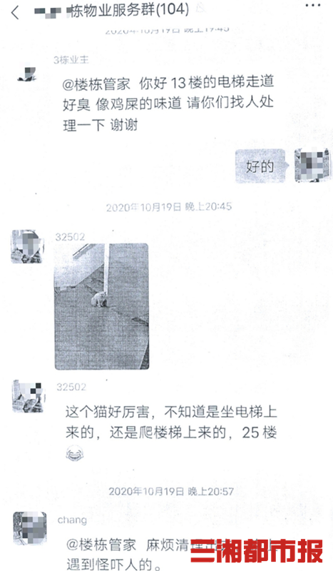 2020年10月的一天晚上,吴先生所在的楼栋物业服务微信群中,一名业主上传了一张猫的照片,并配文称“这个猫好厉害,不知道是坐电梯上来的,还是爬楼梯上来的,25楼。”另一业主随后在群内@楼栋管家,“麻烦清理出去,晚上遇到怪吓人的。”