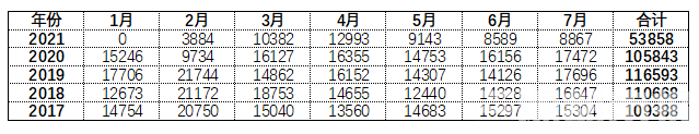 (据湖南省民政厅统计,此表为湖南省2021-2017年1-7月离婚统计情况。(单位:对))