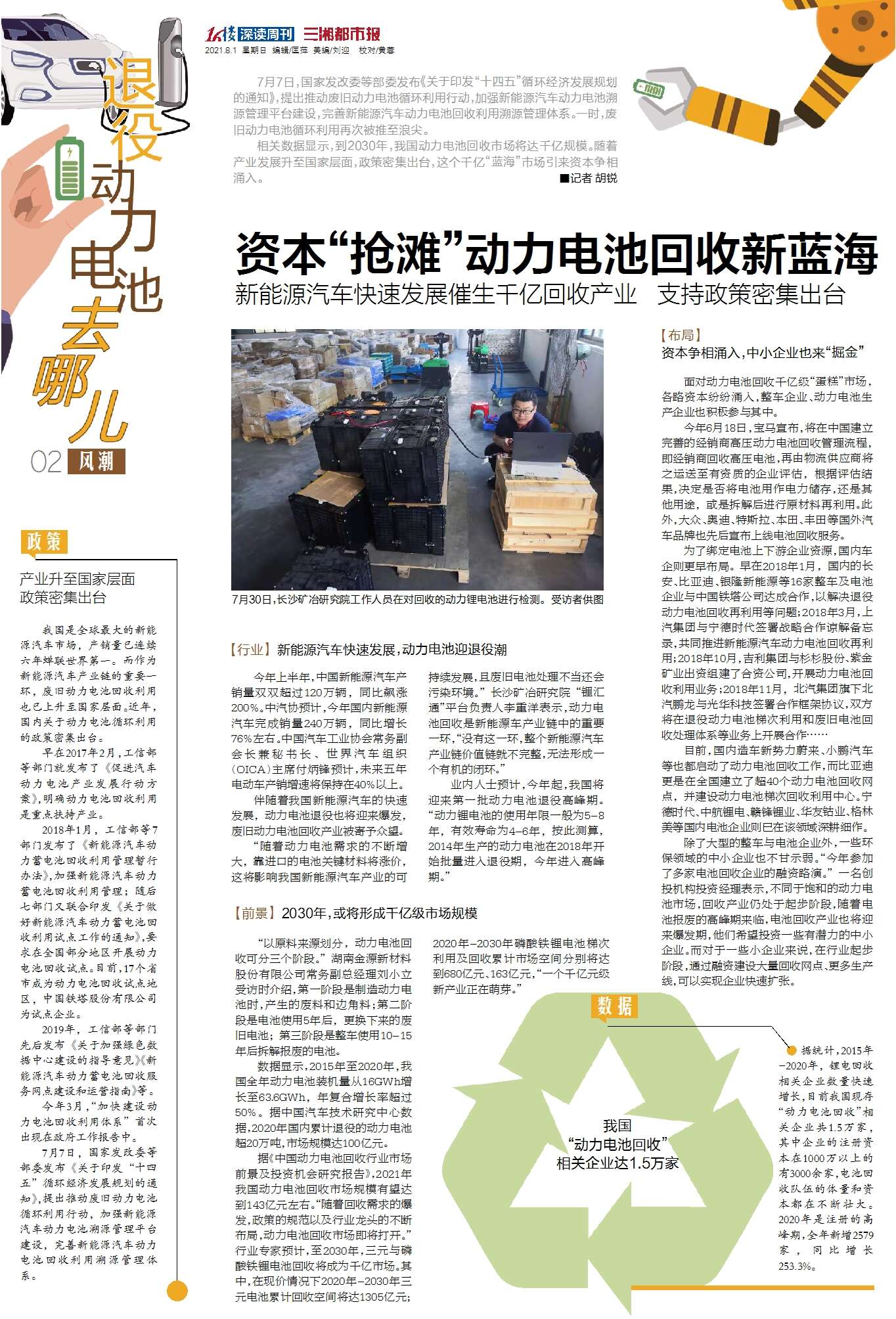 相关数据显示,到2030年,我国动力电池回收市场将达千亿规模。随着产业发展升至国家层面,政策密集出台,这个千亿“蓝海”市场引来资本争相涌入。 ■记者 胡锐