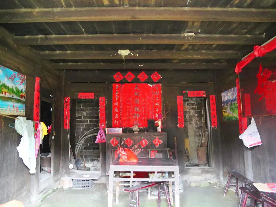 沿着古老的铜鼓石路往前行走,赫然出现在眼前的是一座大楼门。属寨子的主要楼门。木质结构,飞檐斗拱,粗犷宽敞。门槛经岁月磨蚀,深深地凹陷下去,门口青幽的大条石被磨得光洁透亮。沿门两侧呈“八”字形伸展开的墙垛用青砖砌成,墙垛上有彩色字画,年久破损,内容变得神秘,但仍能感觉到她的厚重。楼门旁边有土地屋,生人进去必先叩首揖拜土地菩萨。