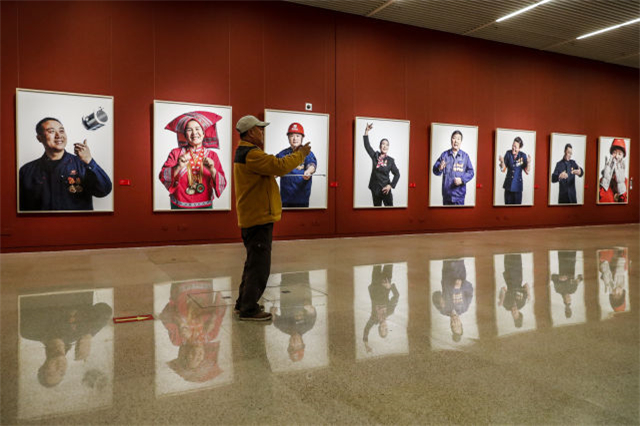 (观众在欣赏《撸起袖子加油干——“中国梦,劳动美”》影像作品展。)