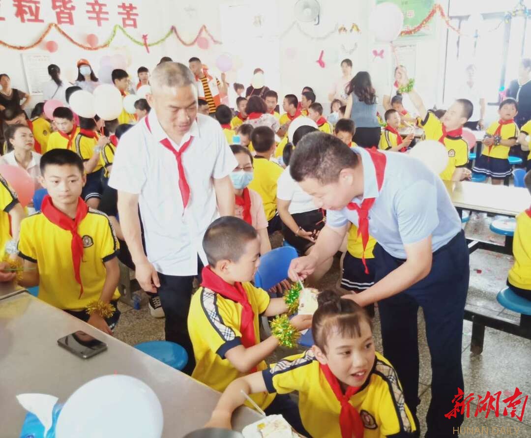 ▲岳阳县教体局局长王敏与学生欢庆“六一”。