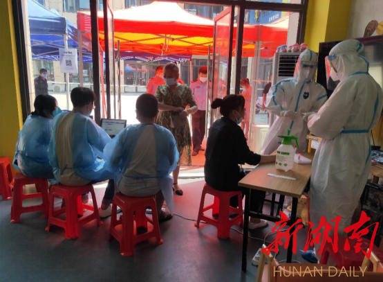 新湖南客户端8月3日讯(通讯员 张宇)8月2日,位于长沙市芙蓉区东岸街道黄泥塘社区的一处商业中心和居民区的一块空旷地异常热闹,社区辖区物业工作人员,窗口单位、服务行业、餐饮门店、酒店工作人员和居民们一起有序地排队,准备接受核酸检测。