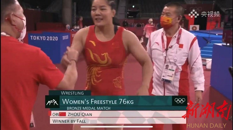 据悉,今年32岁的周倩是川山坪镇燕塘村人,曾获得全运会、亚运会女子摔跤项目金牌。在刚刚结束的2021年东京奥运会上,她以2:0完胜日本对手摘得铜牌,实现了岳阳体育史上奥运奖牌零的突破,她还是汨罗首个走上奥运赛场的女运动员。