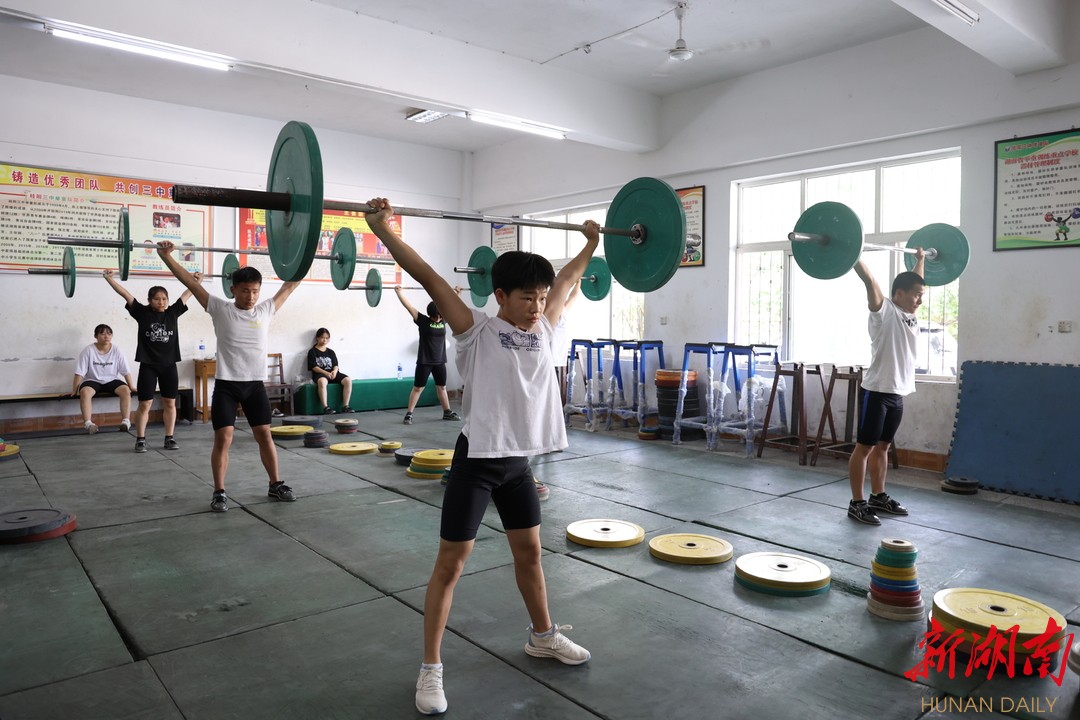 这是桂阳县第三中学体艺馆举重训练房。8月28日,室外气温高达34摄氏度,10余名队员手抓杠铃一起一放,汗流浃背,教练李志平在一旁指导动作要领。
