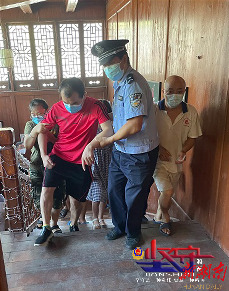 8月3日,凤凰县公安局杜田派出所执勤警员在云桥核酸检测点维护秩序,帮助行动不便的群众进行核酸检测。