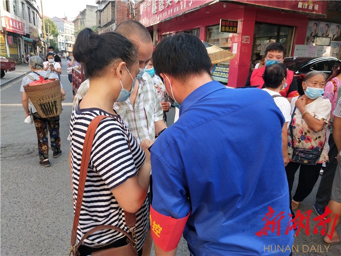 在新一轮疫情暴发后,家住白沙辛女农贸市场附近的胡大鹏,主动请缨,每天上午7点就和其他7名队员一起,劝导在市场周边摆摊的商贩,引导商贩们入市经营、佩戴口罩、做好个人防护。