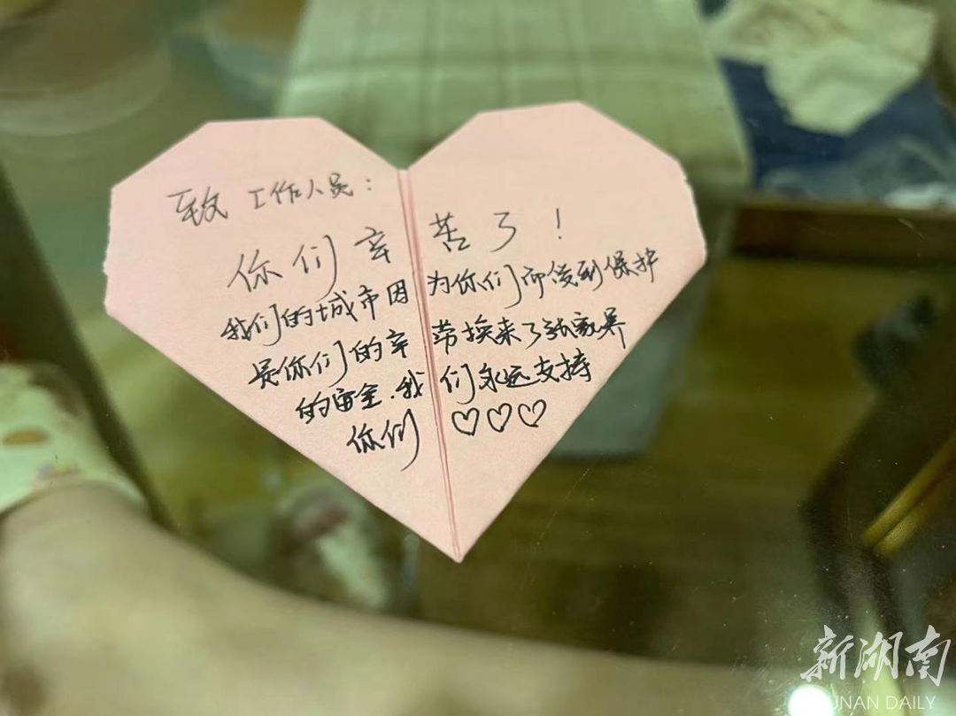 “谢谢大家,这是我过得最特殊最感动,也最有纪念意义的一个生日。”宋同学说,她许下了一个特殊的生日愿望,希望家乡的疫情早日结束,一家人能平安回家,所有坚守在防疫一线的工作人员都能平安健康,大家一起打赢这场防疫攻坚战。并通过医护人员带给工作组一颗粉色的“爱心”——“致工作人员:你们辛苦了!城市因为你们而受到保护,是你们的辛劳换来了张家界的安全,我们永远支持你们。”