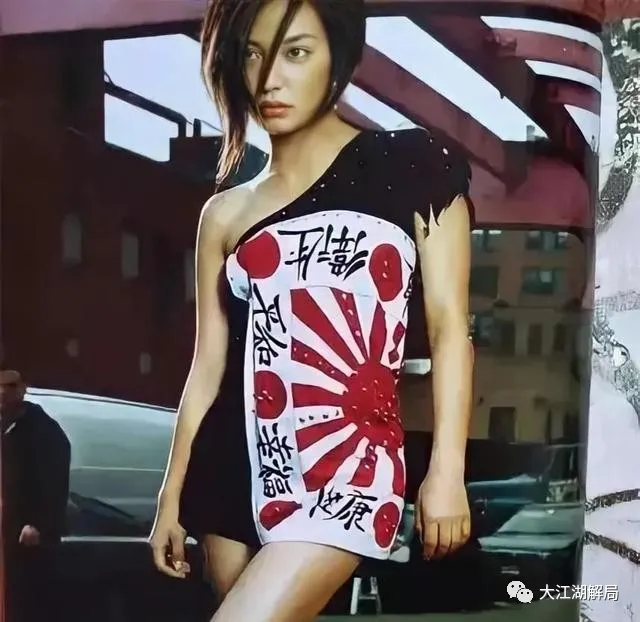 其中有一张照片,赵薇身穿日本军旗单袖短裙,一脸冷酷的表情。