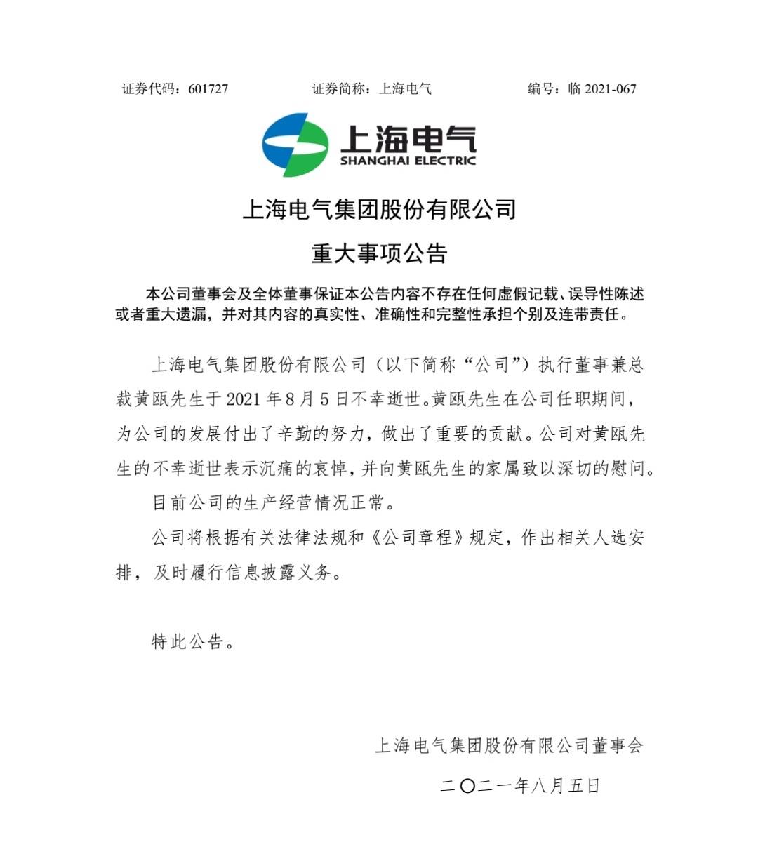8月5日,上海电气发布重大事项公告称,公司执行董事兼总裁黄瓯先生于2021年8月5日不幸逝世。黄瓯先生在公司任职期间,为公司的发展付出了辛勤的努力,做出了重要的贡献。公司对黄瓯先生的不幸逝世表示沉痛的哀悼,并向黄瓯先生的家属致以深切的慰问。目前公司的生产经营情况正常。