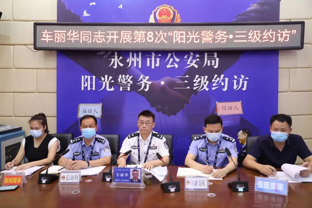 8月5日上午,在永州市公安局人民来访接待中心,副市长、市公安局长车丽华组织开展第8次“阳光警务·三级约访”视频连线。市公安局法制支队、信访科负责人及值班律师陪同约访,县乡村相关负责人通过视频参加约访,并特邀新闻媒体全程跟踪监督。