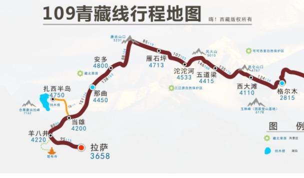 (青藏公路,G109国道青藏线,沿途地点大致示意。图片来源:网络截图)