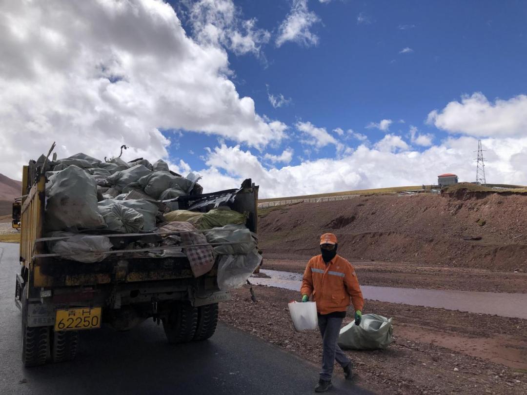 (2021年9月,离开五道梁集镇后,路边遇到的捡拾及运输垃圾的工作人员 李微敖/摄)