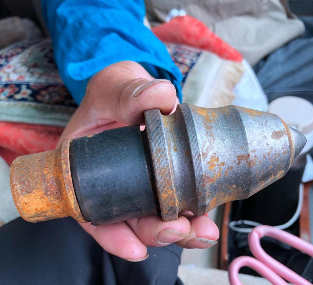 (2021年9月,在G109国道,青藏公路3155-3156路段,一个形如炮弹引信的金属部件,颇为骇人,后经鉴定,实为拖拉机的零部件。李微敖/摄)