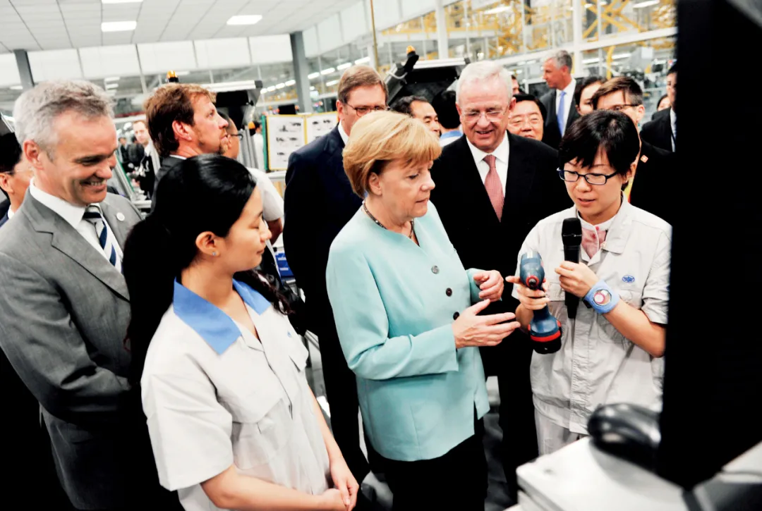 (2014年7月6日,默克尔访问中国期间,在一汽-大众成都分公司考察。图/中新)