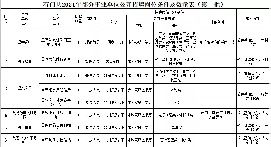 附件:2021年石门县部分事业单位公开招聘岗位条件及数量表(第一批)