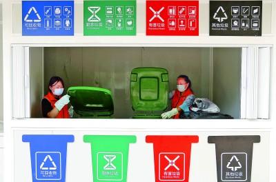 河北省邢台市襄都区城市管理局垃圾分类宣传志愿者在小区垃圾定点分类投放点分拣垃圾。新华社发