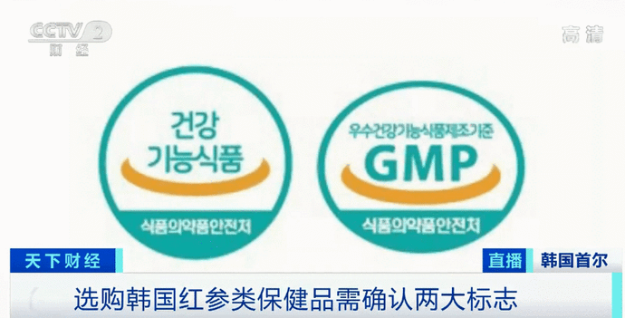 此外,很多食品中都含有红参成分,但如果消费者想购买韩国红参类功能性保健品,需要认准这两个标志,一个是韩国食品医药品安全部的“健康功能食品”标志,另一个是表示企业符合生产标准的GMP认证标志。
