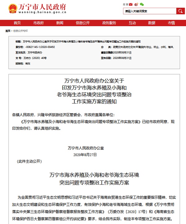 2020年8月15日,万宁市人民政府在《关于全面加强海水养殖管理的通告》中强调,全市海水养殖尾水必须按《万宁2019-2020年水产养殖尾水排放治理方案》要求进行治理,达到《水产养殖尾水排放要求》规定的排放标准方可排放。在2020年10月底前由市生态环境局对各养殖户的排放尾水进行监测,并告知排放尾水水质情况;对超标准排放的养殖场(户)由市综合执法局责令限期整改并处罚款;所有超标准排放的养殖场(户)限于2020年12月底前整改达标,否则不允许继续实施养殖活动。