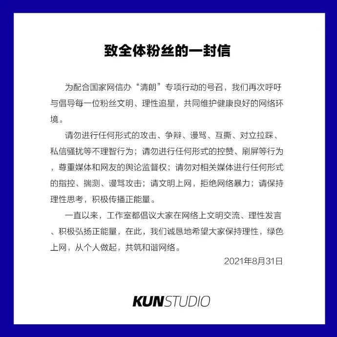 就在这封道歉信发布前1分钟,该工作室还发布了一份《致全体粉丝的一封信》,信中呼吁大家理智追星,不要进行任何形式的攻击、争辩、漫骂、互斯、对立拉踩、私信骚扰等不理智行为,保持理性思考,积极传播正能量。
