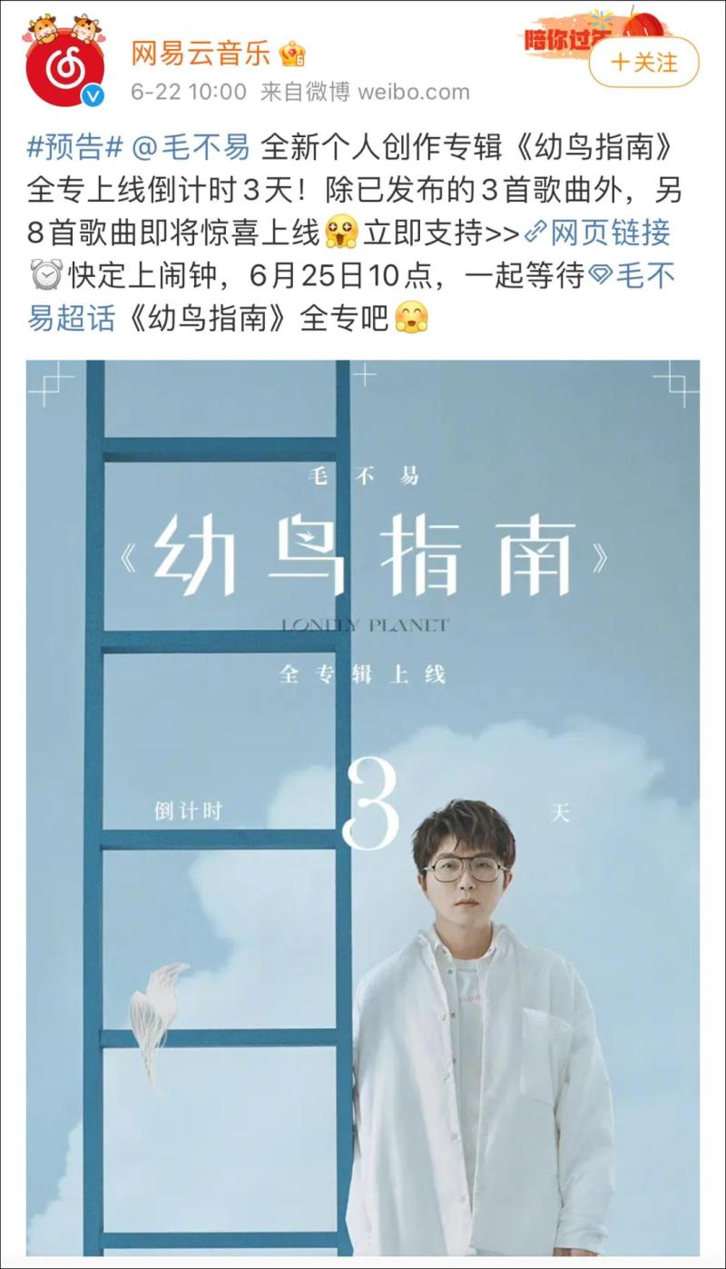 毛不易的专辑《幼鸟指南》包含11首歌,整张专辑在音乐平台售价20元,专辑于今年5月底上线,一开始也是“货不齐”,其中的三首主打曲《城市傍晚》《海上日记》《于是没有洗头》分批次上线,剩下的8首在6月25日一次性放出。
