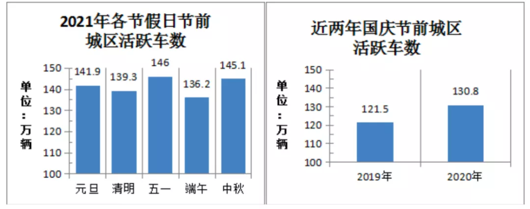 预测2021年国庆节前(9月30日)城区活跃车数为今年以来各节假日节前活跃车数最高的一天,将达到历史最高值。