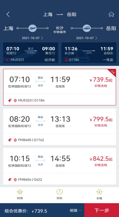 (东方航空APP“航空+高铁”一单支付购票界面)