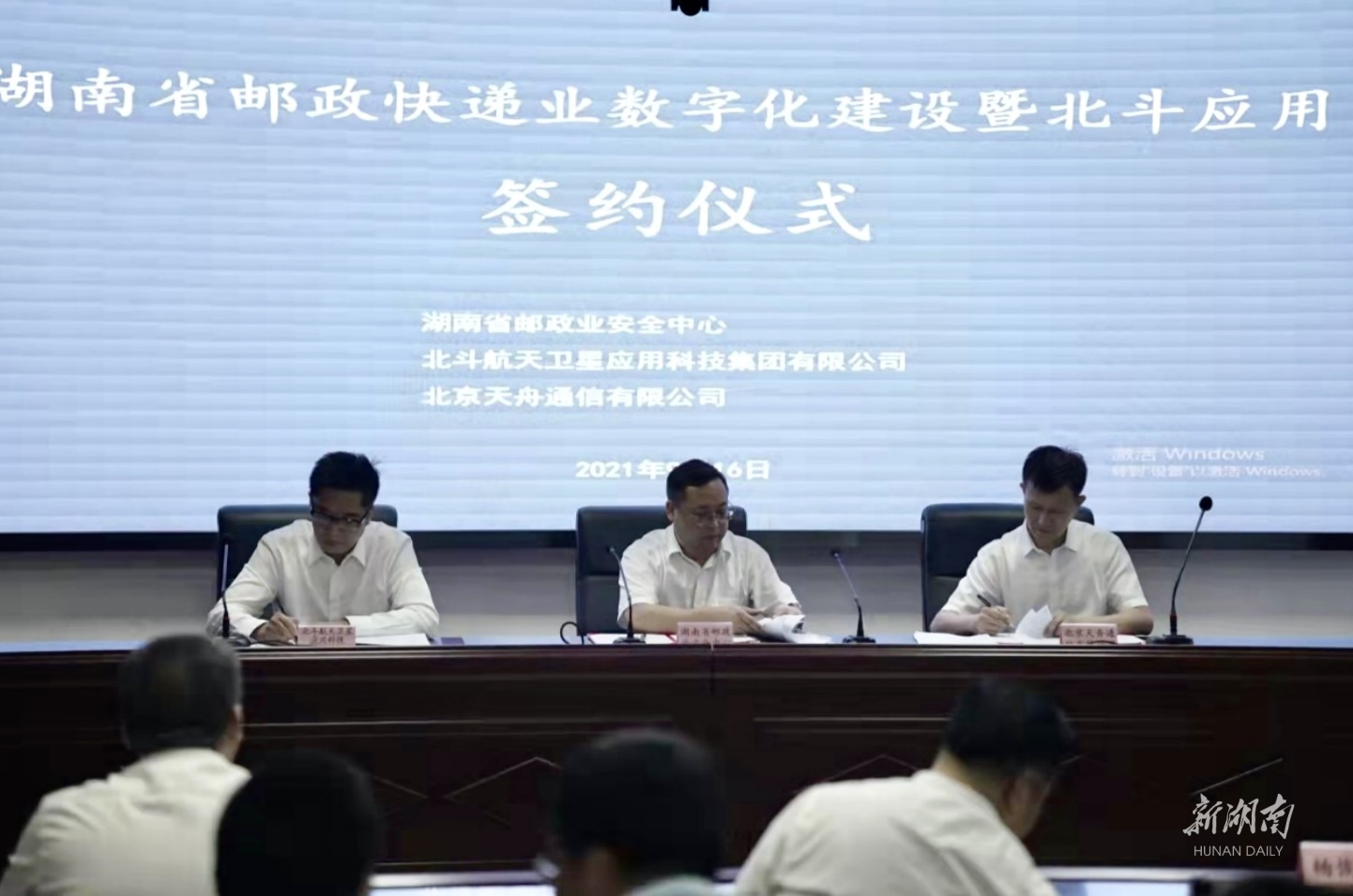 湖南日报·新湖南客户端9月16日讯(记者 彭可心 通讯员 肖罗)今天,湖南省邮政快递业数字化建设暨北斗应用签约仪式在长沙举行。湖南省邮政业安全中心、北斗航天卫星应用科技集团有限公司和北京天舟通信有限公司三方签订合作协议,共同建设湖南省邮政业安全中心信息化技术协同平台。这是北斗在我省邮政快递业的首次规模应用。