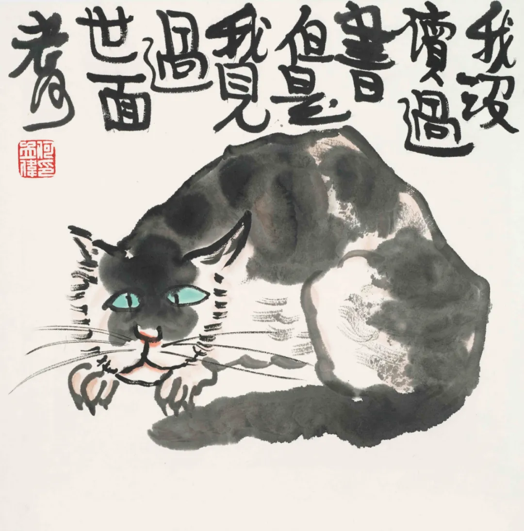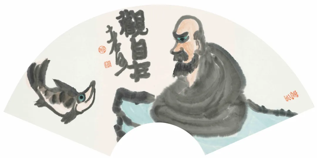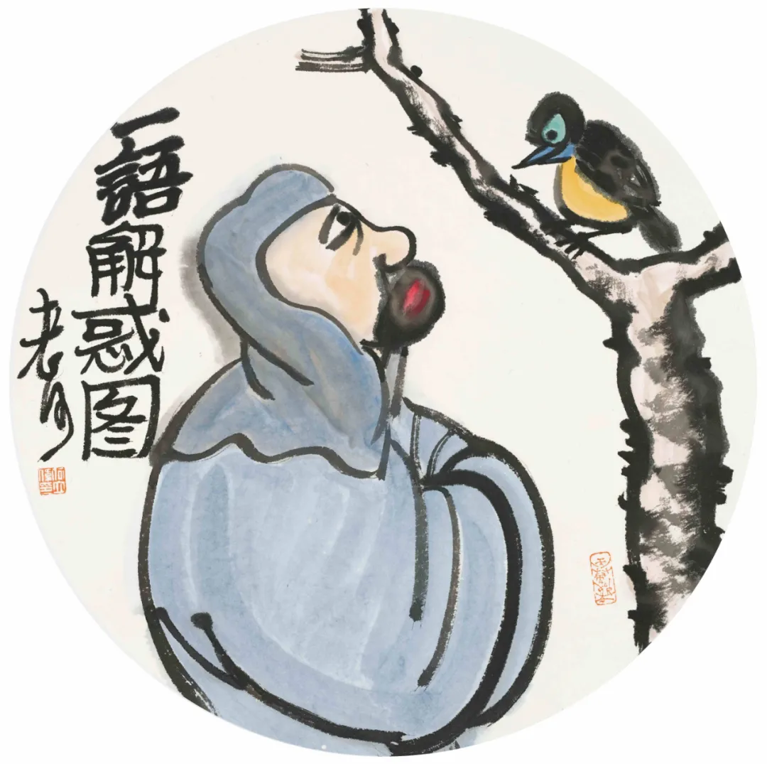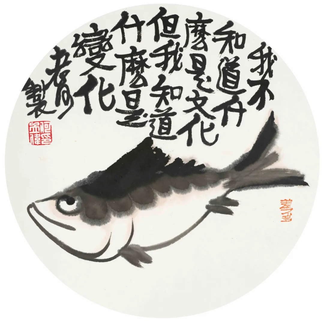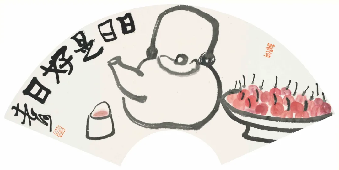 展厅中,近40幅水墨小品端端正正地摆放在墙面上。充满哲理又妙趣横生的文字,寥寥几笔看似漫不经心的“涂鸦”,意趣盎然,让人感受到作者绘画时自得其乐的状态,触摸到作者心灵深处的诗意和快乐。《消夏图》中,几块西瓜、一把圆扇,一句“六月天气热扇子借不得”就把人带回记忆里充满童趣又炎热的夏天。《孕妇图》中,身怀六甲的孕妇,搭上“世界长大了”的小句,颇有韵味。