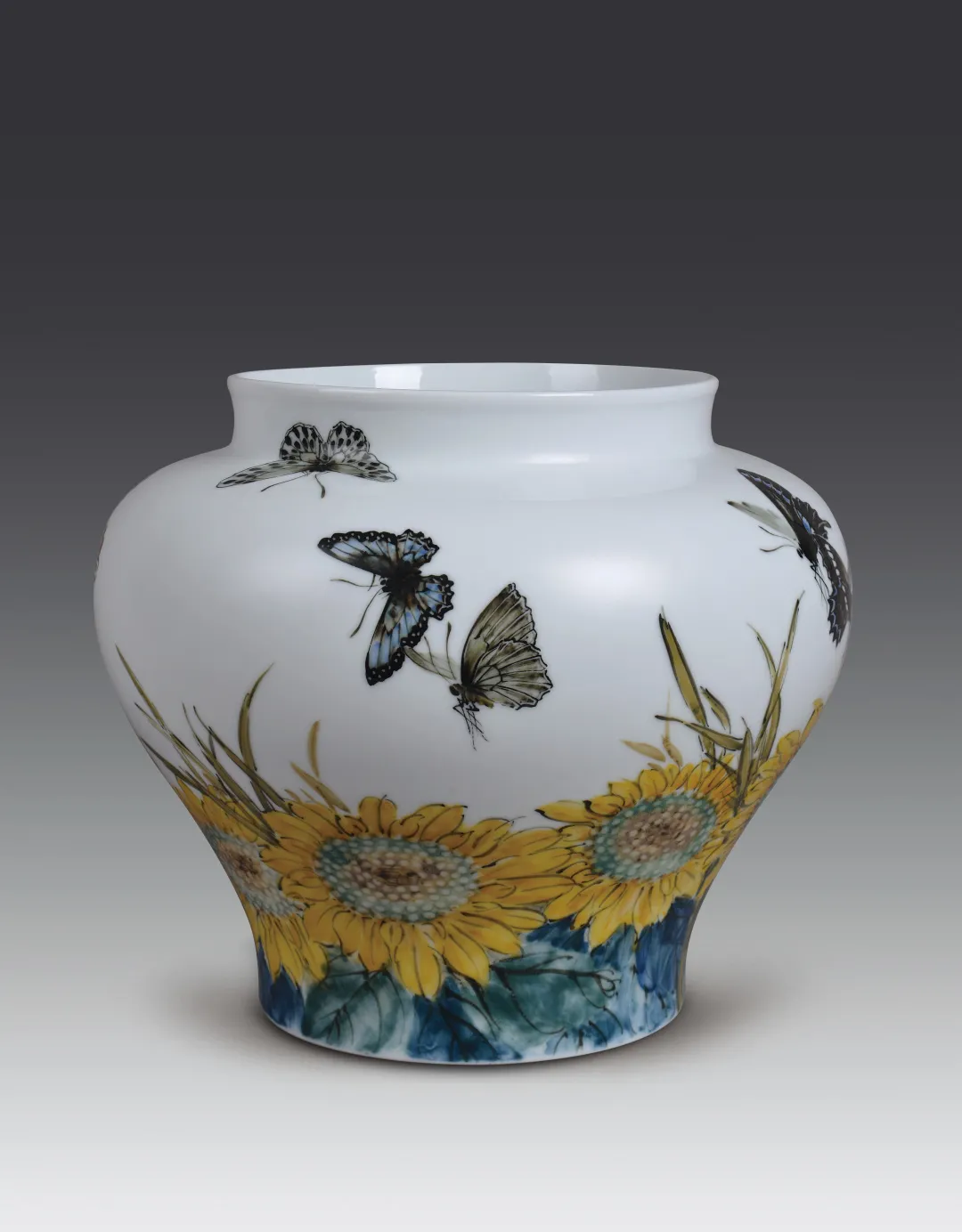 本次展览展出了关兰近年来精心创作的100多件瓷绘作品。关兰在瓷绘创作中融入了岭南画派的撞水撞粉之法,运用堆白、堆雕等工艺的同时,有意弱化釉下五彩的装饰意味。作品清雅明丽,神韵自然,具有一见即识的个性。作品《当青花遇见蒙德里安》系列中,关兰结合了传统传统中国花鸟画的技法和西方抽象艺术,融合中、西艺术的创作手法让青花瓷焕发出了勃勃生机。作品《向日葵粉蝶鼓胸大口缸》中,艺术家以粗犷笔触勾勒出热烈的向日葵,又以精细笔触描摹翩飞的彩蝶,对比展现出自然的勃勃生机。