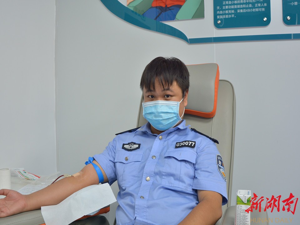 9月27日,张家界市一位RH阴性血患者因病需输血,紧急关头,血站医务工作人员联系上与其血型匹配的武陵源军地坪派出所辅警邓杰。接到电话后的邓杰没有过多思考,便立即与同事协调执勤任务,只用了不到30分钟,就从武陵源区赶到市中心血站爱心献血屋,无偿献血400毫升。