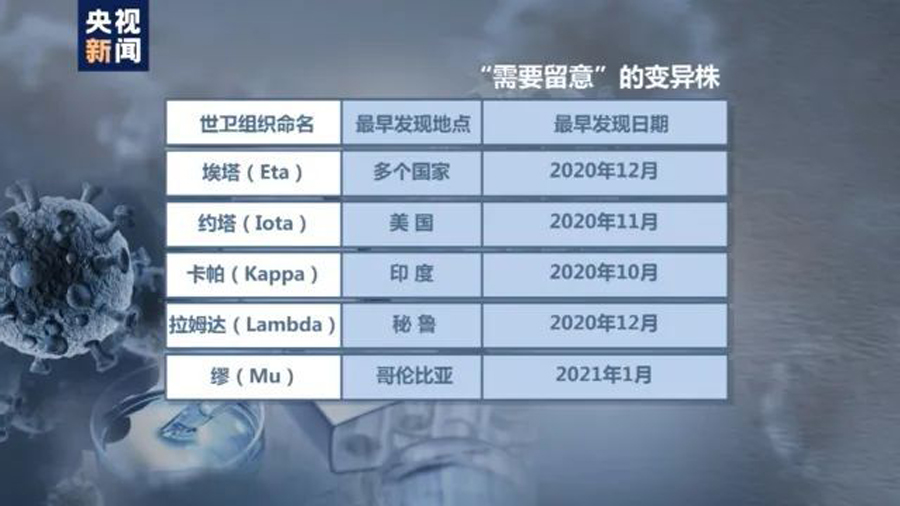 新冠肺炎疫情暴发以来,已经出现了多种变异毒株。为了方便公众讨论并防止对发现地的污名化,世卫组织在今年5月决定以希腊字母来命名新冠病毒变异株。