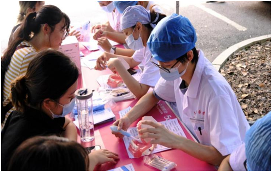 活动现场,由长沙医学院口腔医学院的老师和附属医院口腔科老师们对前来的同学们进行口腔疾病的检查、口腔健康咨询答疑等,口腔医学技能协会志愿者则进行现场口腔宣教,发放口腔健康宣传册。