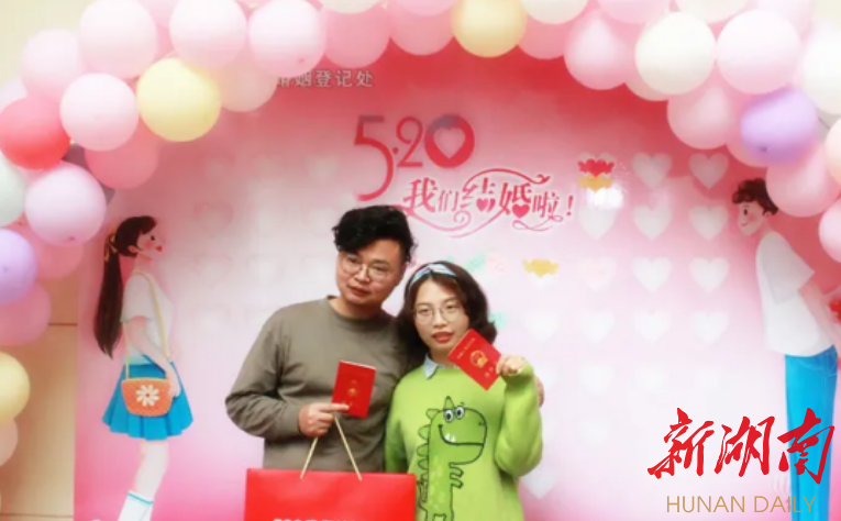 定居长沙岳麓区的向女士和许先生恋爱近7年,选择在“520”当天来到天心区办理登记,“听说这边是‘网红’登记点,十分适合拍照,就特意过来了,也很方便。”