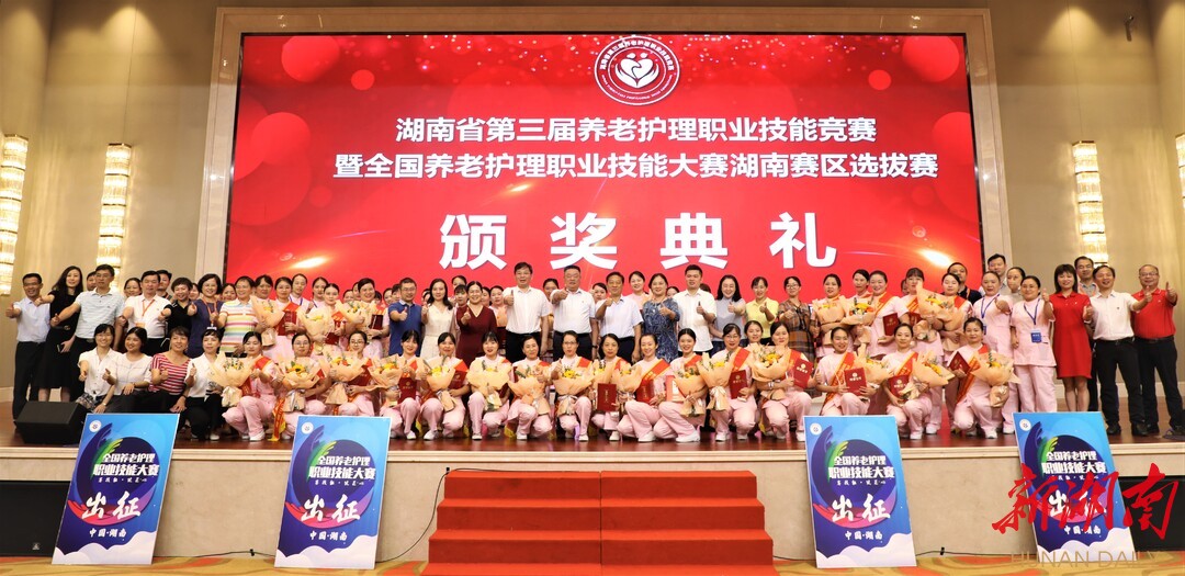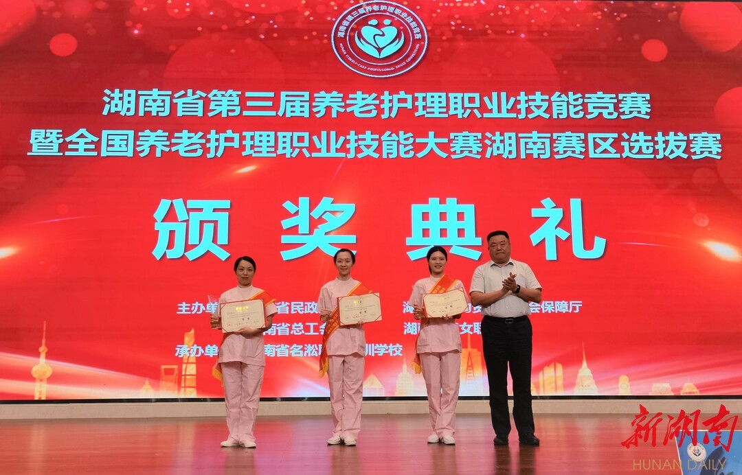 新湖南客户端9月26日讯(记者 詹娉俏 曹晓林 通讯员 魏柳清 摄影 骆祖武)老吾老以及人之老,9月26日下午,由湖南省民政厅、省人社厅、省总工会、省妇联联合主办的第三届养老护理职业技能竞赛暨全国养老护理职业技能大赛湖南赛区选拔赛圆满落幕。来自全省的56名选手参加了本次竞赛,张威、翟浩霖、陈望满分别荣获选拔赛个人一等奖,被授予“湖南省技术能手”和“湖南省巾帼建功标兵”荣誉称号,其中张威还被授予“湖南省五一劳动奖章”。