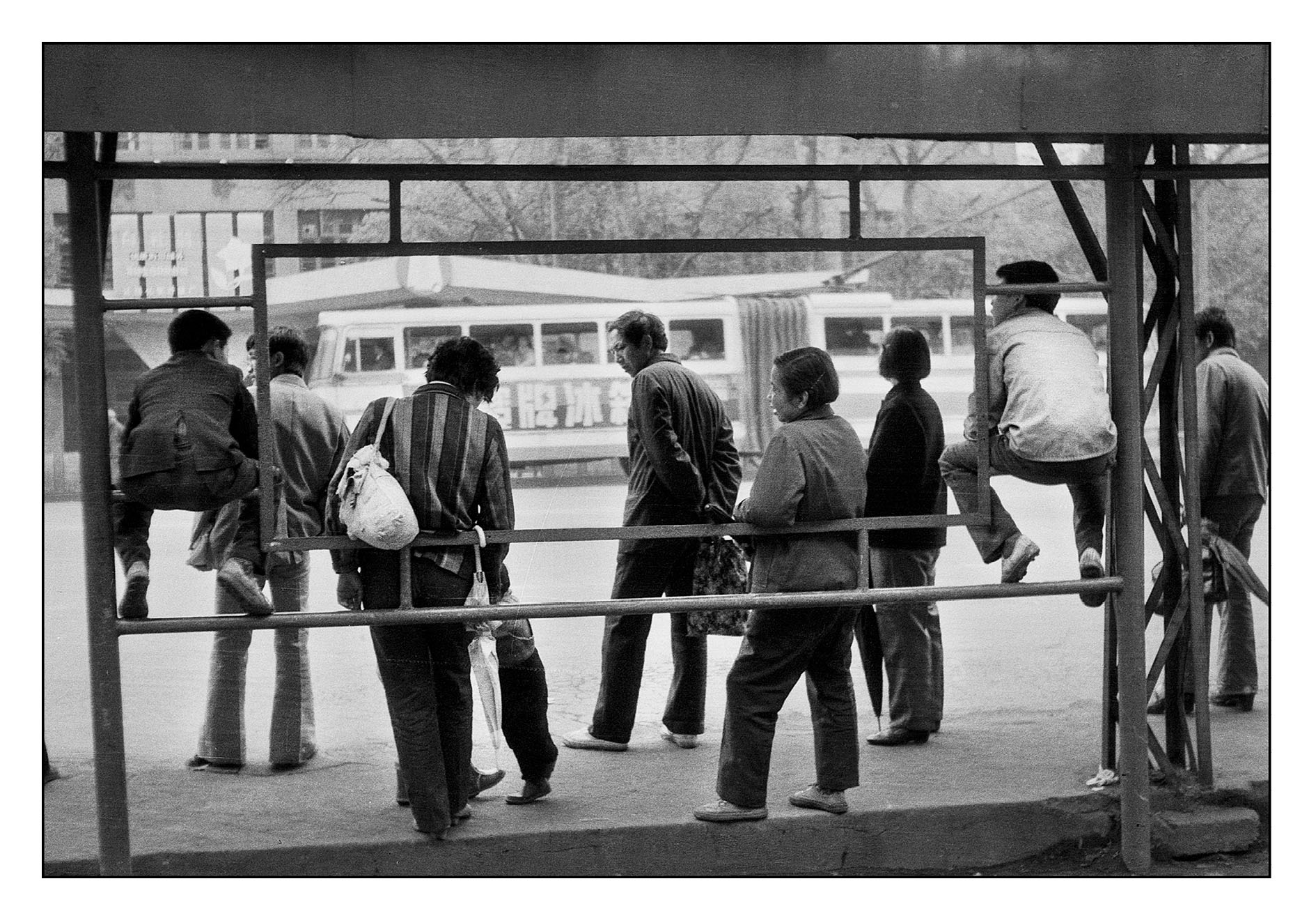 △1990年,江西南昌。洪城商场前等车的人们。冰箱广告、喇叭裤、解放鞋和简陋的公交车站台,这些符号都是那个时代留下的记忆。这时的我正读大二,刚刚喜欢上摄影。