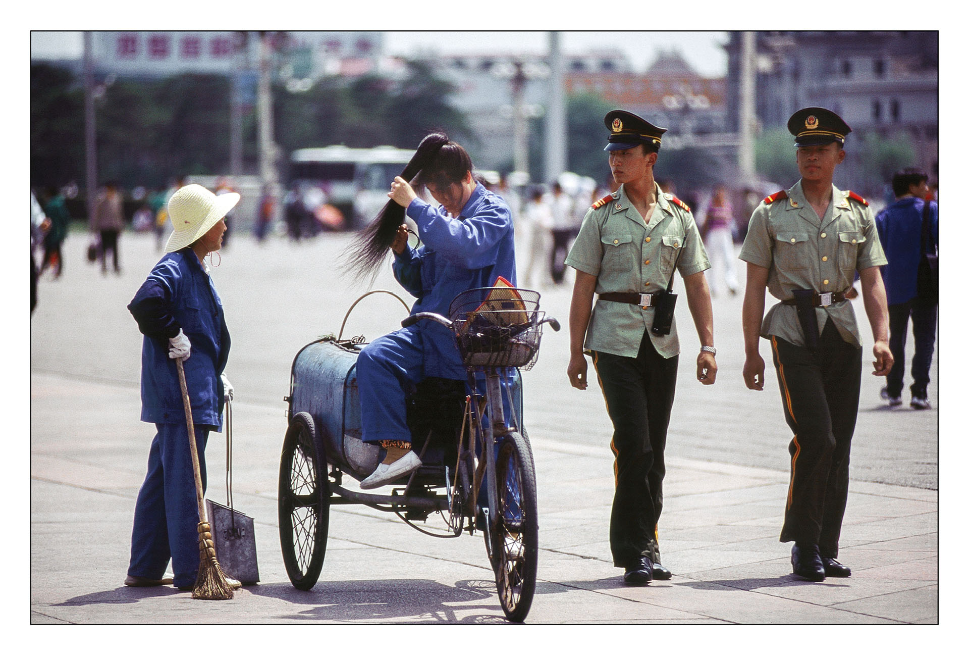 △1999年,北京天安门广场。年轻的环卫女工爱美,趁休息时扎下长长的秀发,两位武警小伙走过,其中一位没忍住瞥了一眼。上世纪90年代的天安门广场是摄影扫街爱好者们扎堆的地方,每次去北京出差我都习惯性去转一转,每次都有收获。