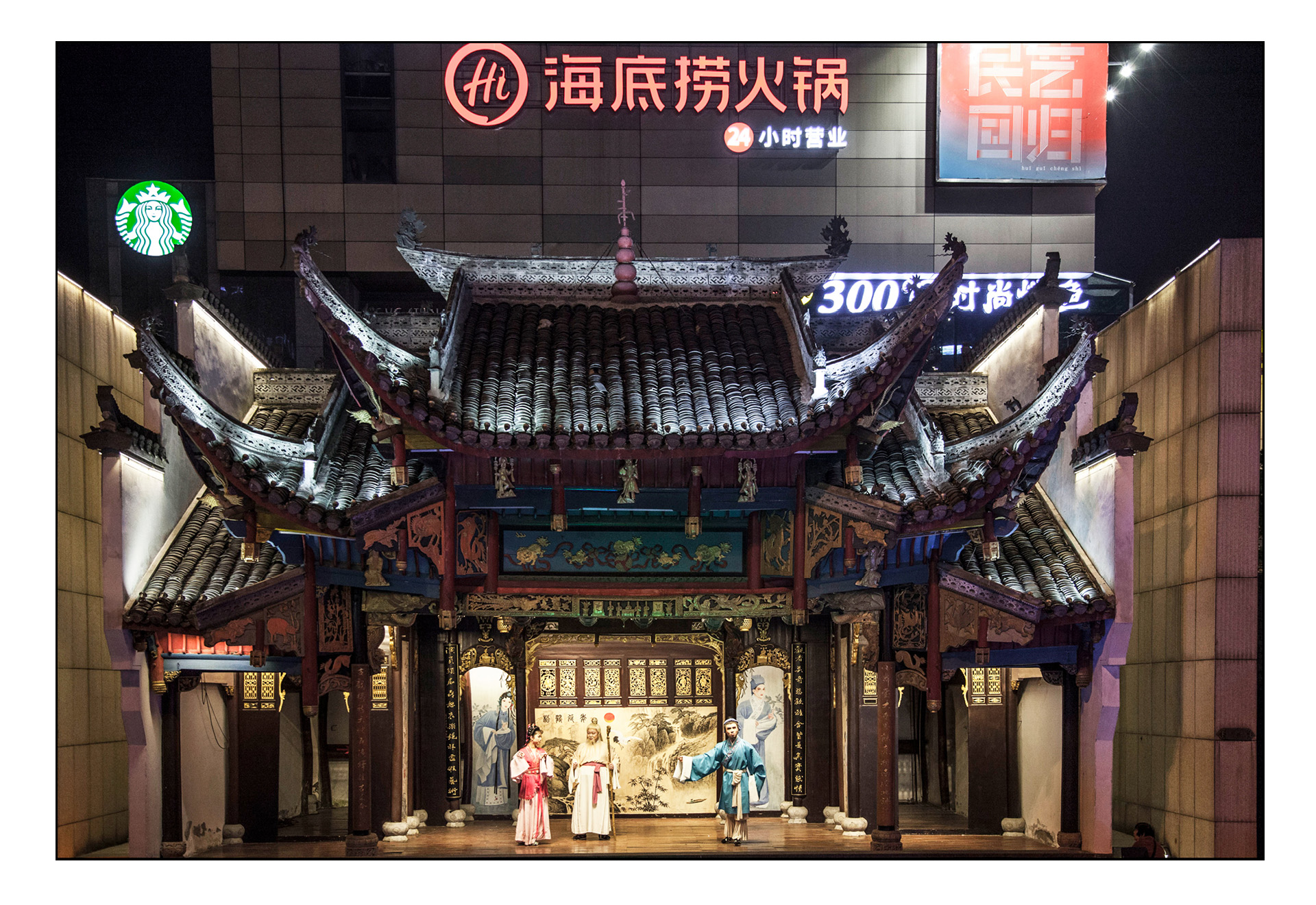 △2017年,安徽合肥。夜幕下,步行街和老戏台和谐相处,逛街累了,这里可是什么都全,想安静可以去民艺回归,想热闹的有海底捞火锅,想中式的可以看会儿戏,想洋气的可以去星巴克。所有的元素混搭在一起一点也不违和,今天的中国这种景象处处可见。