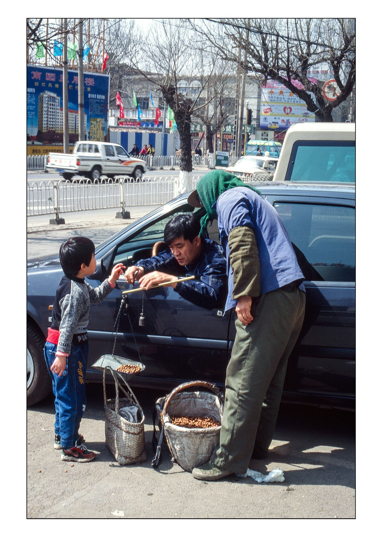 △1996年春天,辽宁沈阳太原街。从小我一直听说东北人大方豪爽,第一次去东北就发现一个开着车的大男人(那时候开得起车的人都是有钱人)为买栗子和小商贩讨价还价,看来这位东北男人也很会过日子啊。这张取名为做《斤斤计较》的照片后来被网民评为1999年网络十大流行照片之一,很多人不认识我,都认识这张照片。