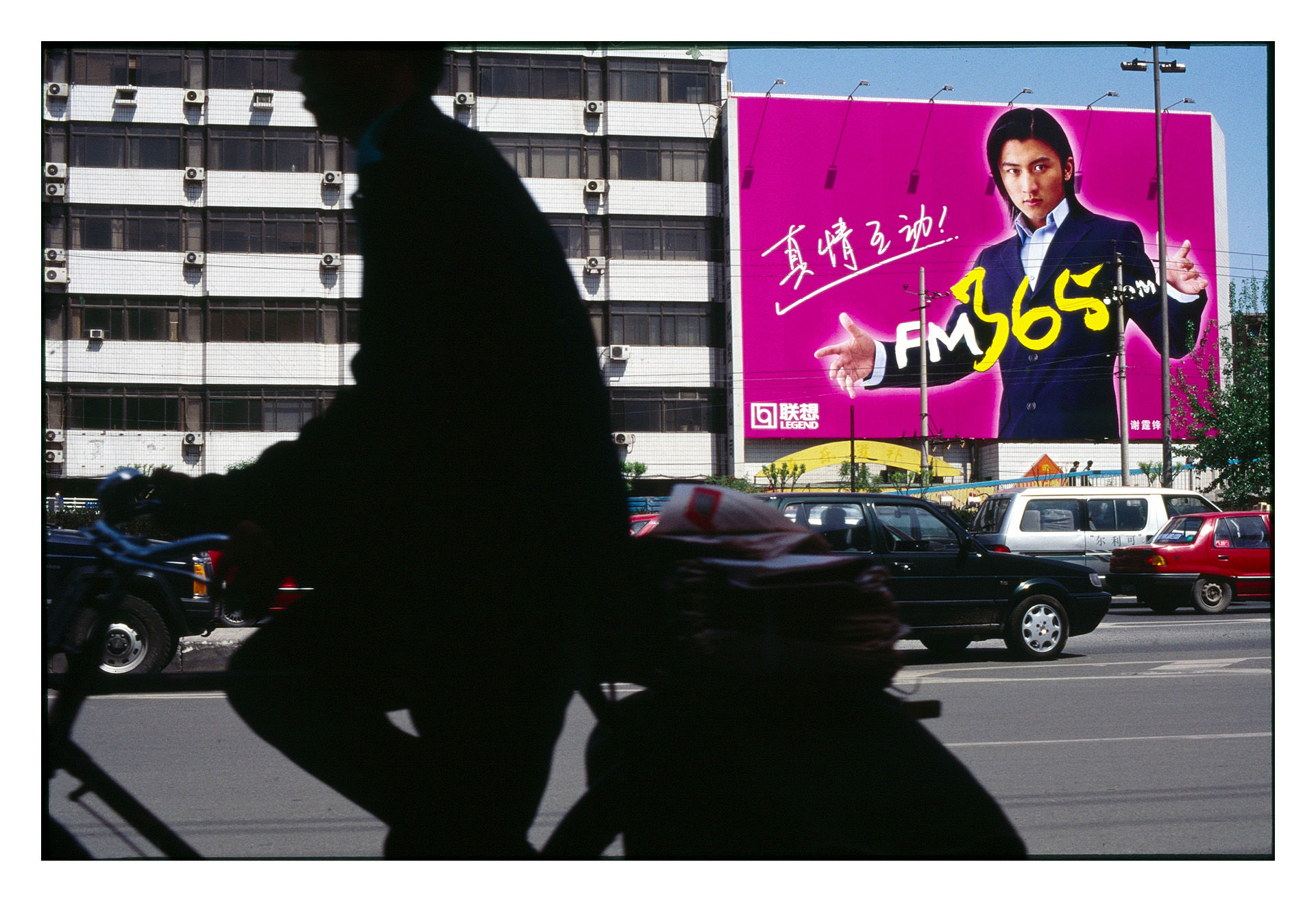 △2000年,北京中关村。一位送报纸的邮递员经过FM365的巨幅广告前。热衷于读报纸的时代还没过,互联网大潮却悄悄开启了。联想集团的FM365网站请了谢霆锋做广告代言人,可传统IT也玩不转新的互联网,这个当年风风火火开张的网站,2003年就倒闭了。