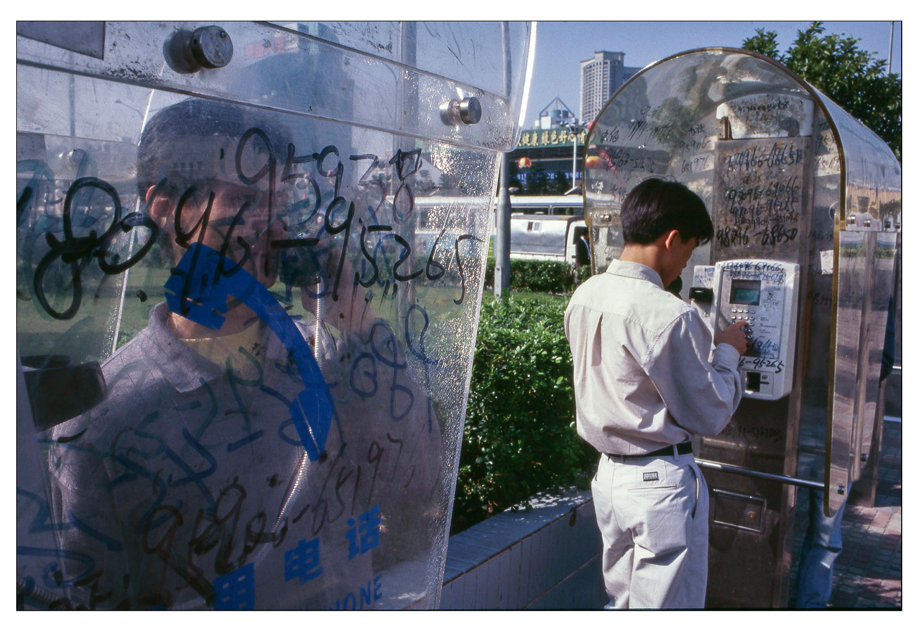 △1993年,北京王府井。街头电话亭前排队打电话的人。看看国内预收20、国际预收200元的收费,就知道那时候打电话消费并不低,但这并不能挡住人们沟通的欲望。那时我刚刚参加工作不久,月工资200多块。