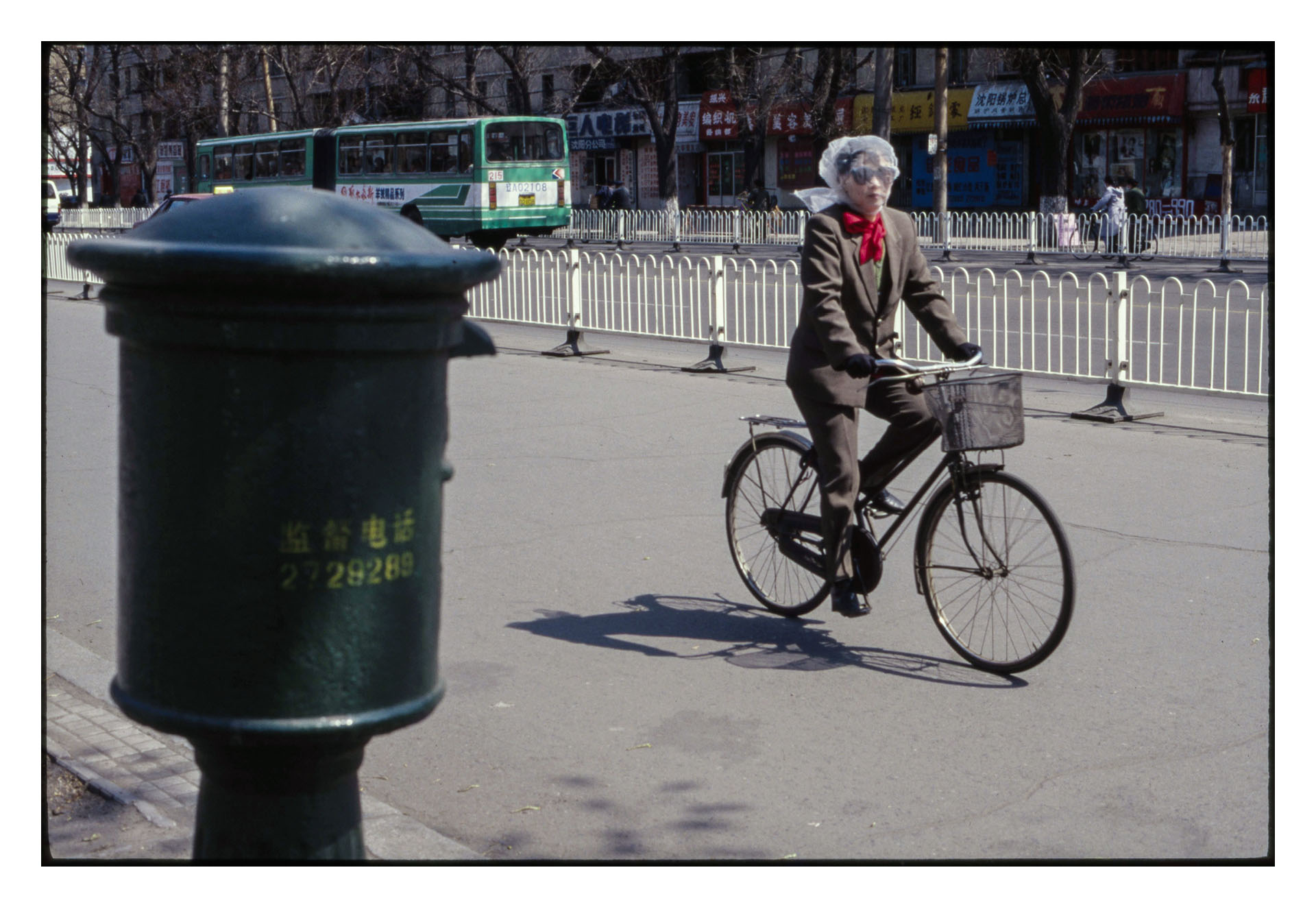 △1996年,辽宁沈阳。一位带着面纱的妇女骑车经过街边的一个邮筒。女同志的衣服和邮筒的颜色,今天看起来都是颜色沉闷,但却有着说不清的亲切感。那个年代我们爱写信,过去的信件更多是真情实感,却远远比不上今天EMAIL邮件的高效率。