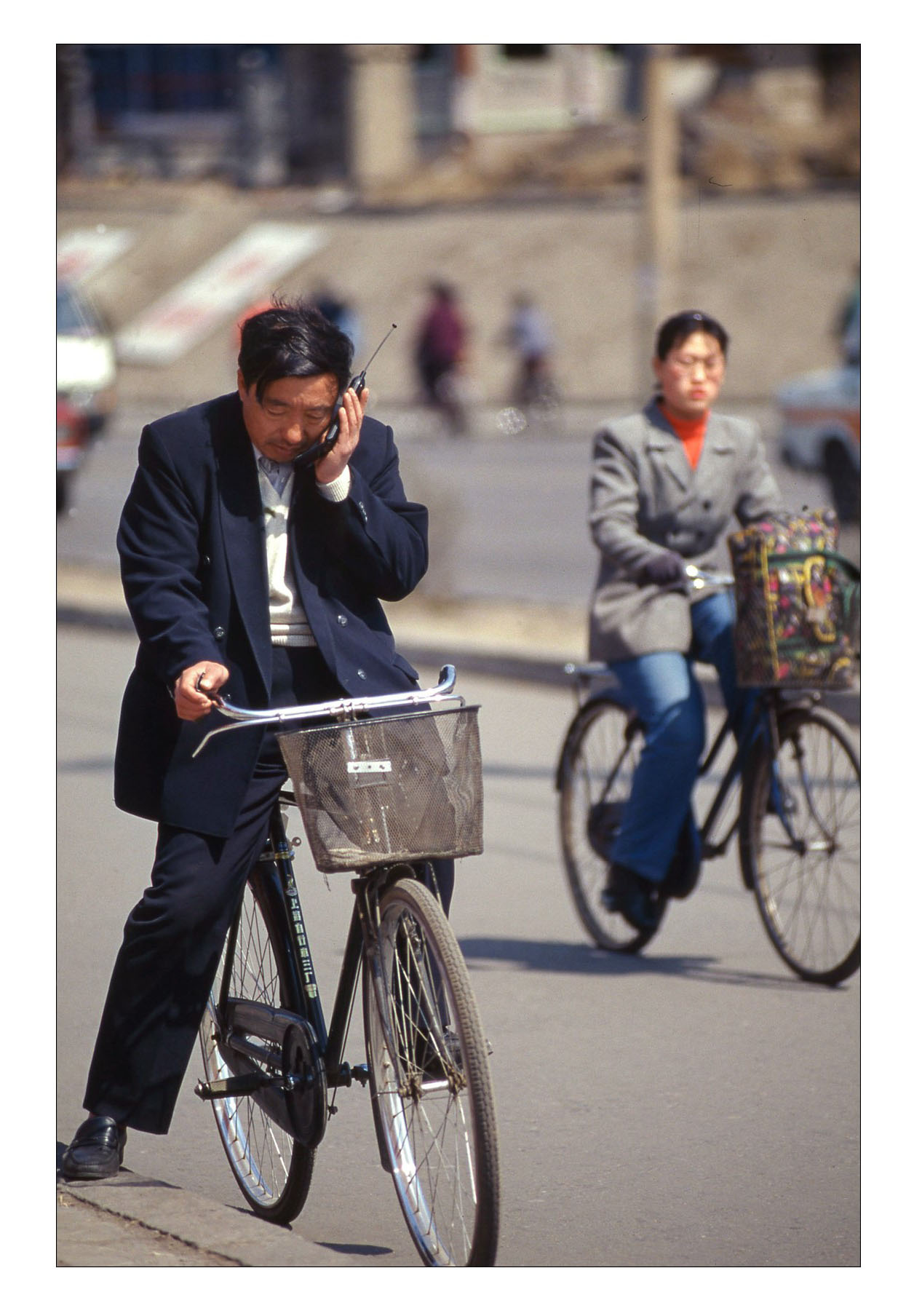 △1996年,辽宁沈阳。穿西装掏出翻盖手机,跨着自行车打电话的男人,找了根电线杆停住了,因为只有这下面信号才最好。在我月薪只有一千多的时候,我也曾经花了差不多一万块买了这么一个“龟背”,每次看到这照片都会勾起我痛心疾首的回忆,年轻时我可真败家啊。