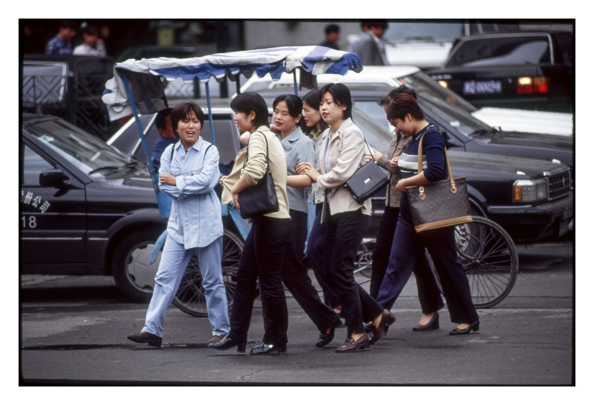 △1999年,北京街头。一群女孩从小汽车和三轮人力车旁经过,唧唧喳喳准备去逛街。她们的穿着和身上背着的各式小包,就是那个时代职业女性的典型形象。