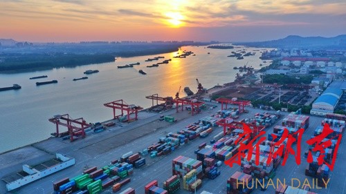 (长沙新港,大型船舶正由起重机械装卸货物,即将扬帆远航。覃翊 摄)