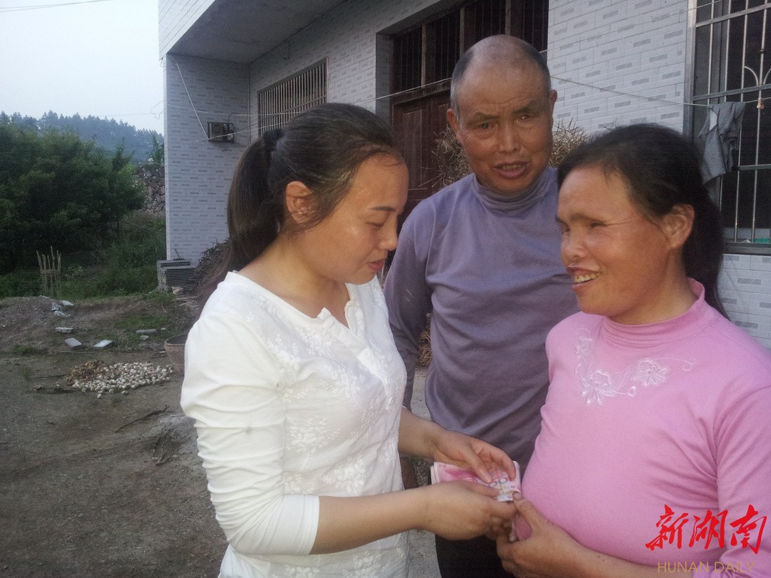 彭元梅的母亲双目失明,父亲一只眼睛失明。图为2015年5月,韩燕老师为彭元梅家送去资助款。